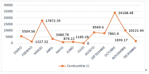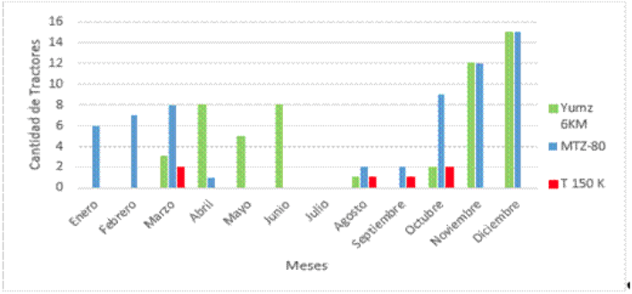 En la Figura 3 se muestra el comportamiento del consumo de combustible por meses con la utilización de los tractores mostrados en la Figura 2. Como se puede apreciar existen picos de mayor consumo en determinados meses del año como por ejemplo en el mes de marzo (17 872,35 L) y en el mes de octubre es de 24 168,48 L. Estos consumos se deben a que en esos momentos existe la mayor demanda del uso de la maquinaria según el plan de producción agrícola de la empresa en correspondencia con las campañas de lluvia o seca para los cultivos planificados.
