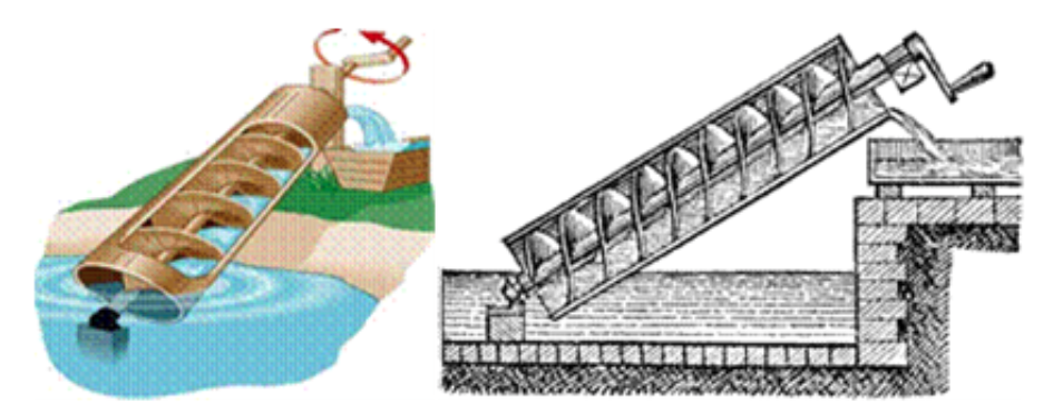 El tornillo de Arquímedes se ha utilizado ampliamente durante siglos y es importante destacar que se ha empleado para elevar el agua de riego y el drenaje de la tierra, este a menudo fue impulsado energéticamente por la fuerza del hombre o la de los animales, las cuales estimo que en su momento daban solución al riego agrícola, pero con la fuerza limitada de estas el trabajo sería muy forzoso y poco productivo; además, para poder extraer mayores volúmenes de agua se necesitaría construir modelos más grandes, pero la limitante en su diseño sería que las fuentes energéticas existentes no serían suficientes para impulsarlo; por lo que tendrían que buscar una fuente más potente y que humanizara el trabajo, ya que estas máquinas se caracterizaron por ser impulsadas por un solo hombre, que se agotaba, se enfermaba, necesitaba detenerse para comer, beber y realizar sus necesidades fisiológicas