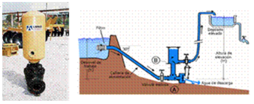 El sistema de bombeo por ariete hidráulico consiste en una bomba de fluido impelente que emplea la energía cinética disponible de una corriente de agua, para bombear una parte de ésta a una mayor carga o altura, sin el uso de otra energía, es decir, bombear agua con la propia agua. El efecto de bombeo se produce cuando penetra en su interior la corriente de agua, que es cortada bruscamente a intervalos regulares mediante un fenómeno hidráulico conocido como “golpe de ariete” (Figura 4) (Hajj, 2015). Es una tecnología que se ha utilizado durante los últimos dos siglos con muchas variaciones en el diseño y configuraciones básicas (Szali et al., 2018).
