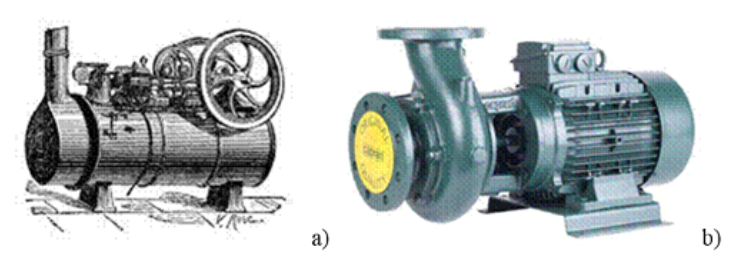A finales del siglo XVIII se produjo un gran avance cuando James Watt inventó la máquina de vapor (Figura 5a). En el siglo XIX la producción de motores térmicos y eléctricos (Figura 5b), y el rápido desarrollo de la industria y el crecimiento de la población urbana plantearon problemas cuya solución era imposible sin el uso de bombas. En este momento, la fabricación de bombas se convirtió en una industria importante, y su valor solo aumentó con el tiempo, buscando continuamente formas de mejorar el rendimiento de las bombas y hacer que estos dispositivos sean más confiables, eficientes y económicos (Sava Pump, 2010).