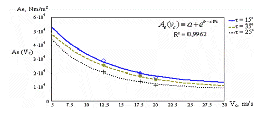 Donde se obtuvo como resultado que la energía específica durante el corte de los tallos en función del ángulo de deslizamiento para diferentes velocidades, caracterizada por la obtención de un valor mínimo de la energía de corte para un ángulo de deslizamiento en el entorno de los 25o. Asimismo se obtuvo una disminución de la energía específica con el incremento de la velocidad de corte, coincidiendo la tendencia con la obtenida por otros autores en otros cultivos de tallos gruesos, caracterizada por un comportamiento asintótico a partir de los 20…30 m/s, según la Figura 3.