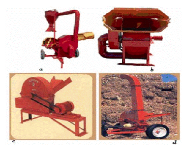 En la figura 5 y 6 se muestran algunas máquinas picadoras de forraje. En la industria de diseño y producción de la maquinaria especializada para el corte del forraje se puede destacar la NOGUEIRA de Brasil, ha puesto su empeño en diseñar máquinas forrajeras de gran eficiencia y productividad para la alimentación animal, como el Modelo EN-12 y el Modelo DPM-4, de la Figura 5. Además, en la Figura 6 se muestran algunos modelos de la firma AZTECA de origen mexicana, a). Modelo 18-32, b). Modelo 20-36, c). Picadora de forraje eléctrica modelo AZTECA y d). Picadora de forraje para acoplar a tractor modelo AZTECA, según Valdés (2008).