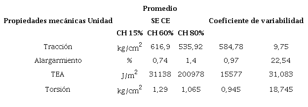 Estas propiedades físicas y mecánicas guardan una relación muy estrecha con el contenido de humedad en los productos agrícolas, debido a esto se han realizado estudios dirigidos a evaluar el comportamiento de las mismas, con distintos porcentajes de humedad, según Olea et al. (2018). El autor realizó un análisis del comportamiento de las propiedades mecánicas de tracción como alargamiento, energía específica al alargamiento o tracción, absorción de energía a la tracción (TEA) y torsión, bajo dos condiciones de humedad y envejecimiento para fibras de “Tamshi” (Heteropsis flexuosa (Kunth) G.S. Bunting) (Tabla 1).