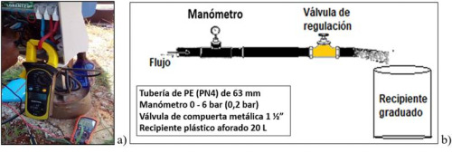 En cuanto a los parámetros eléctricos, se colocaron dos multímetros en la entrada de energía del controlador PS2-150 (Figura 4a), para medir el amperaje y el voltaje del arreglo fotovoltaico (de los cuales se calculó posteriormente la potencia eléctrica), así como la temperatura ambiente debajo de los paneles solares, en el ensayo de medición de los parámetros hidráulicos del sistema.