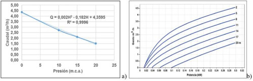 La Figura 5b muestra los gastos obtenidos para diferentes potencias y presiones de acuerdo al fabricante; en la misma puede observarse que para la máxima potencia de 0,3 kW, la cual coincide con las obtenidas en el ensayo realizado, se obtienen caudales de 4,60, 3,25 y 1,90 m3/h para presiones de 2, 11 y 20 m.c.a.