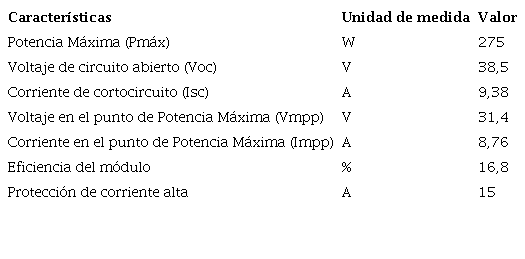 Según el fabricante, las características del equipo evaluado, es un sistema de baja potencia, que consta de un generador fotovoltaico compuesto por dos paneles fotovoltaicos (Figura 2a), marca Sharp con un área cada uno de 1,66 m2 (1,66 m largo x 1 m ancho), que fueron interconectados en paralelo para conformar una unidad generadora de corriente continua (CC), las características eléctricas de los mismos se muestran en la Tabla 1.