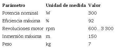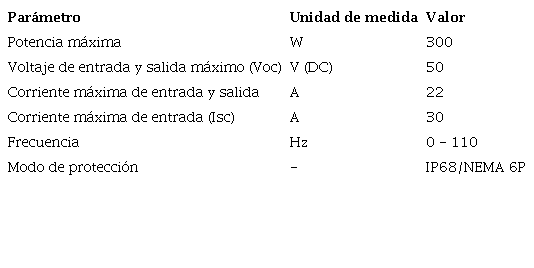 La bomba sumergible del conjunto (Figura 2c), es de funcionamiento centrífugo con carga máxima de 20 m y gasto máximo de 4,6 m3/h (1,28 L/s). Salida roscada de 1,5”. Construida de acero inoxidable AISI 304, provista de válvula de no retorno y con protección para funcionamiento en seco. Puede trabajar en pozos con diámetro mínimo de 4” y temperatura del agua de 40°C. Dicha bomba trae incorporado un motor modelo ECDRIVE 150-C, que es de corriente directa (CC), sin escobillas que son libres de mantenimiento y es sumergible en agua; éste tiene materiales Premium de acero inoxidable AISI 304/316 y no posee elementos electrónicos en el motor (Tabla 3).