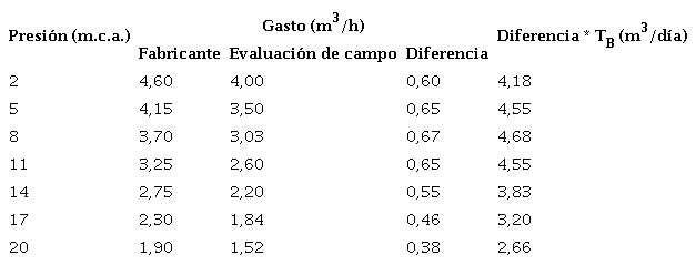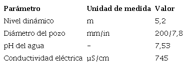Dado que los datos del acuífero sobre el que descansa el suelo de la estación experimental es conocido y en el mismo hay instalado bombas de hasta 270 m3/h (75 L/s), no se consideró necesario realizar un aforo del pozo previo a la evaluación de esta bomba de bajo gasto. La Tabla 4 muestra las características del agua y del pozo donde fue instalada la bomba.