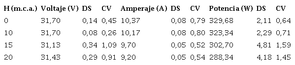 Como puede observarse en la Tabla 5, durante el ensayo realizado el mayor valor de voltaje registrado fue de 31,70 V en las alturas de presión 0 y 10 m.c.a, y el mayor valor de amperaje fue 10,37 A para 0 m.c.a. de altura. En el análisis estadístico de todos los valores de los parámetros medidos dentro del ensayo, los coeficientes de variación son menores al 20% lo que muestra poca dispersión de los datos. Puede concluirse que la potencia obtenida durante el período de evaluación fue como promedio de 0,3 kW.