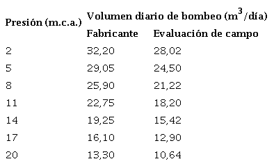 Como puede observarse en la Tabla 7, el volumen de bombeo de agua diario (sea el del fabricante o el obtenido en la evaluación de campo), disminuye a medida que aumenta la altura de presión, esto ocurre porque según Carmenates et al. (2017) y Universidad Internacional de Riego (2021) a mayor caudal demandado por la instalación, se tendrá una menor presión, y al contrario, a menor caudal la bomba impulsará el agua con una presión mayor.