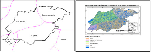 Los estudios realizados por el INRH dentro del Proyecto BASAL según (BASAL, 2017) mostraron que el municipio Jimaguayú está ubicado en un acuífero libre, con rocas de baja permeabilidad, de ahí la infertilidad de muchos de los pozos perforados. La profundidad de yacencia oscila entre los 1,5 y los 5,0 m de profundidad, pudiendo llegar en escasas zonas hasta los 10,0 m. El territorio municipal se encuentra distribuido en cuatro cuencas superficiales: Saramaguacán, Najasa, San Pedro y Negro de los Remedios (Figura 1).