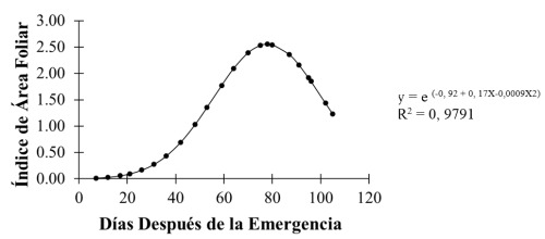 donde: A es el Índice de Área Foliar (IAF), P es la Masa Seca Total de la parte aérea (MST) y t es el tiempo transcurrido desde la germinación, en días.