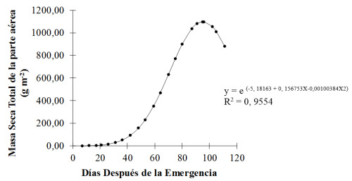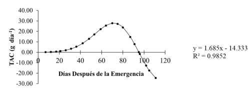 A partir de la primera derivada de las ecuaciones obtenidas, se estimó la Tasa Absoluta de Crecimiento (TAC) de la Masa Seca Total de la parte aérea y el Índice de Área Foliar (ecuación 2), según las fórmulas descritas en la literatura (Torres, 1984).