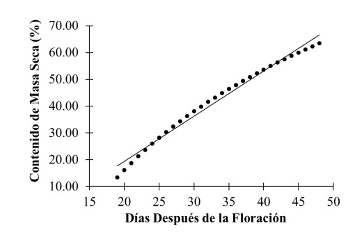 Duración del Llenado Efectivo del Grano (DLlEG): Esta ecuación permitió la predicción del inicio y final de la fase lineal, cuando el grano de maíz alcanzó el 13 % y 64 % de masa seca; respectivamente (Borrás et al., 2009). Por lo tanto, a partir de la ecuación anterior, se cuantificaron los días desde el inicio de la fase lineal hasta la madurez fisiológica y este período se consideró como el valor de la variable, de acuerdo con los estudios sobre este tema (Gasura et al., 2013).