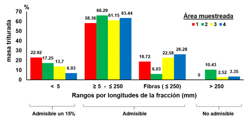 En la Figura se puede determinar que las fracciones comprendidas en los rangos incluidos desde ≥5 hasta ≤250 mm (incluyendo a las Fibras) alcanzan valores entre el 72,32% al 89,72% y son las de mayor contenido de masa maderable dentro de los requisitos exigidos por la bioeléctrica, mientras la masa triturada total admisible para el consumo por la bioeléctrica, incluyendo las <5 mm, varió del 87,32% al 97,35%; registrándose en todos los muestreos realizados valores de fracción no admisibles por la exigencia, indistintamente, por su límite inferior, superior o por ambos, aspecto que limita el adecuado aprovechamiento del material cosechado. Esta situación debe ser estudiada para adoptar acciones que posibiliten su eliminación.