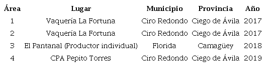 Las investigaciones se desarrollaron en áreas infestadas con marabú de las provincias de Ciego de Ávila y Camagüey durante los años 2017, 2018 y 2019 (Tabla 1).
