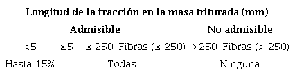 Para la determinación del fraccionamiento del material triturado se tomaron de la tolva de la máquina tres muestras de 3 kg de material triturado cada una en cada área muestreada, estableciéndose para su análisis detallado siete rangos de medidas por la longitud en milímetros de los fragmentos que las que componen: ≤1, >1 - <5, ≥5 - <25, ≥25 - <100, ≥100 - ≤250, >250 y las fibras; identificando a estas últimas, como un segmento de material de longitud mayor de 50 mm, espesor no mayor a 1 mm y ancho variable. La selección del material de cada rango se realizó combinando dos formas de ejecución: por tamizado las inferiores a 5 mm, empleando dos tamices de malla con agujeros de sección cuadrada de 1 mm2 y 25 mm2, respectivamente; y por medición directa de su longitud, con el empleo de patrones de medidas establecidos a tales efectos, para el resto de los rangos. El material contenido en cada rango, incluyendo las fibras, fue pesado con una balanza digital de precisión 0,1 g y determinada su presencia en porciento respecto al peso total de la muestra analizada.