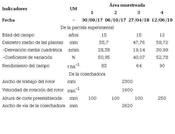 En la Tabla 3 se registran las condiciones de realización de los trabajos de campo, donde los diámetros medios obtenidos están en correspondencia con la edad de los campos, ocupados por plantas de un elevado crecimiento, y sustentan los rendimientos de campo registrados, según lo planteado por Bravo et al. (2015).