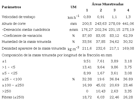 El material triturado admisible para su empleo por la bioeléctrica alcanzó valores entre el 87,32 al 97,35% del total de material cosechado;