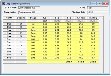 Con la finalidad de estimar los requerimientos hídricos del frijol, fue utilizado el programa CropWat (Allen et al., 2006), versión 8.0, tomando como insumo los datos aportados por la estación meteorológica 363 de Contramaestre perteneciente al INSMET-Cuba (2018, 2019), además de las variables de cultivo y suelo en tiempo real.