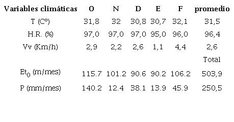 Para el trabajo se realizó un balance hídrico de la zona que incluye el periodo de siembra del frijol (octubre - febrero) con la finalidad de conocer los meses donde existen déficit hídrico por tanto donde el riego es necesario como complemento de las precipitaciones, para el balance se utilizaron las variables del clima tomadas de la estación 363 del municipio Contramaestre perteneciente al (INSMET-Cuba, 2018, 2019). En el caso de la variable precipitación los valores se tomaron de un pluviómetro ubicado en el área de estudio. En la Tabla 1 se resumen los valores promedio mensuales del periodo de la campaña 2018-2019 comprendidos en el estudio, las que fueron utilizadas en la corrida del programa CropWat.