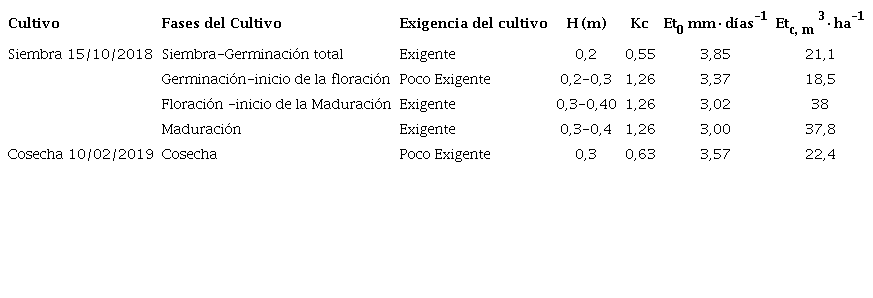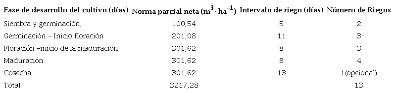 Palabras clave: Manejo del riego, norma neta total, modelación, fases de cultivo.