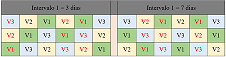Foi utilizado o sistema de rega superficial na modalidade rega por sulcos, de acordo aos intervalos pré-estabelecidos. A quantidade de água aplicada foi de 16 362 mm para o intervalo de 3 dias e 9 090 mm para o intervalo de 7 dias. Durante o experimento registaram-se 12 dias de chuva de forma intercalada, com uma contribuição total de 127 mm, perfazendo um total de 16 489 mm para o intervalo de 3 dias e 9 217 mm de água para o intervalo de 7 dias.