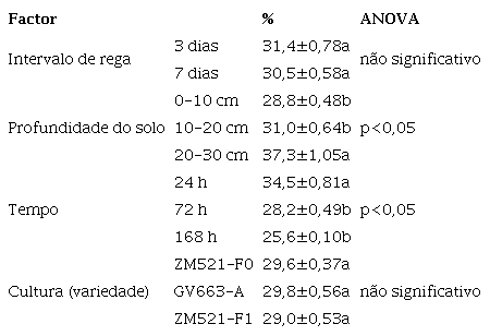 Foram registados valores de humidade do solo em torno de 30%, com uma variação significativa apenas em função da profundidade e o tempo (Tabela 3). O teor máximo de humidade do solo foi de 37% na camada de solo de 20-30 cem de profundidade e o teor mínimo foi de 25% 168 horas após a realização da rega. Além disso, observou-se um decréscimo de 6,2% do teor de humidade do solo nas primeiras 72 horas após a realização da rega, o qual correspondeu a um decréscimo médio de cerca de 2% por dia, ao passo que a partir de 72 horas até 168 horas após a realização da rega a variação do teor de humidade do solo foi de 2,6%, correspondendo a um decréscimo médio de 0,65% por dia. Não foi detectada qualquer interacção significativa entre os factores estudados sobre o teor de humidade do solo.