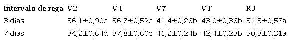 O teor de clorofila variou significativamente entre as distintas fases fenológicas, mas sem variação significativa em função do intervalo de rega, excepto na fase V2 (Tabela 4) em que o maior valor foi detectado no intervalo de rega de 3 dias. A fase V2 constitui um período crítico para a cultura do milho do ponto de vista das necessidades hídricas, pelo que, considerando que a disponibilidade de água constitui um factor determinante para o processo de fotossíntese, os resultados mostram que o intervalo de rega de 3 dias proporcionou maior disponibilidade hídrica na fase V2, tal como pelo Franciele et al. (2014) reportaram que o menor intervalo de rega proporcionou maior incremento no teor de clorofila em relação o maior intervalo de rega.