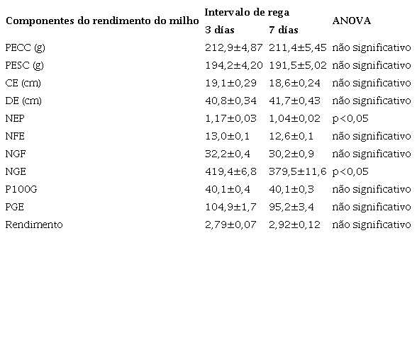 De forma geral as médias dos intervalos de rega não apresentarem diferenças estatísticas significativas quanto aos componentes do rendimento (comprimento da espiga, número de fileiras e peso dos grãos), entretanto, valores relativamente altos foram encontrados no intervalo de rega de 3 dias, contrariando o facto que quando o milho se encontra no seu estádio fisiológico reprodutivo precisa de muita água para melhor formação da espiga. Esses dados corroboram com os enccontrados por Kuhn et al. (2016) que com a aplicação de diferentes lâminas de água na cultura do milho o número de fileiras por espiga não apresentou diferença significativa entre os tratamentos.