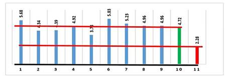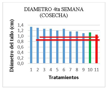 Con respecto a los indicadores determinados, en la Figura 2 se observa que en el comportamiento de la altura de las plantas a partir de la segunda semana no hay diferencia significativa de los tratamientos evaluados (1 al 9) con respecto al tratamiento 10 (NPK); en cambio si se nota la diferencia desde la 1ra semana con respecto al tratamiento 11 (control 000) en el cual no se aplicó ningún fertilizante, que al principio la altura de las plantas era mayor, y luego ya en la tercera semana se van quedando atrás en el crecimiento.