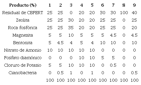 El trabajo se realizó en un organopónico experimental ubicado en Arroyo Naranjo; en canteros de asbesto cemento con una longitud de 9 m y un ancho de 0.90 m. Para hacer las evaluaciones agronómicas se utilizaron once tratamientos; de ellos: nueve formulaciones que fueron entregadas por el Centro de Ingeniería e Investigaciones Químicas (CIIQ); una formulación con NPK (fertilización tradicional) y un testigo sin aplicación de fertilizante (control 000).