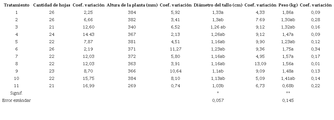 En la Tabla 3 se muestra la media y los coeficientes de variación obtenidos en todos los indicadores estudiados (cantidad de hojas, altura de la planta, diámetro del tallo y peso). Se observa que el coeficiente de variación en todos los casos es menor de un 17%, que indica que las muestras tomadas son representativas. Se demuestra que los valores obtenidos en la media son significativos en el caso del diámetro del tallo y doblemente significativo en el peso, lo que corrobora que no hay diferencias significativas en los tratamientos con respecto al NPK.