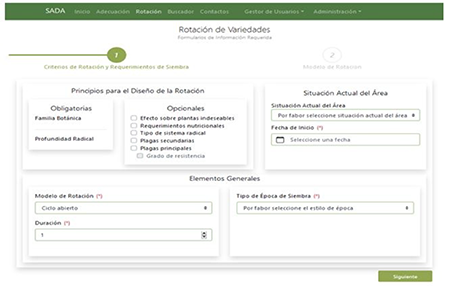 Modelo de rotación de cultivo. Esta página permite agregar de forma individual en la rotación, aquellas variedades que cumplieron los principios definidos, para lo cual se exige que se defina su ciclo y tiempo de preparación de suelo. También admite eliminar la última variedad agregada al modelo, obtener detalles de una variedad seleccionada (imágenes, descripción y datos técnicos de interés) e imprimir el modelo, además muestra una barra de tiempo que registra el tiempo empleado y el restante de la rotación en curso. De manera similar, muestra en la zona central una pizarra de sucesión en ejecución, que permite visualizar de cada variedad agregada su imagen y datos principales referentes a la rotación.