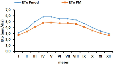 La Figura 1 muestra la relación entre la ETo calculada por el método de Penman modificado Doorembos & Pruit (1977) y el método de Penman-Monteith (Allen et al., 2006). Como puede observarse en la figura, la ecuación de Penman modificado sobrestima el valor de la ETo como promedio de todos los meses en un 13.7%, con valores notables superiores al 17% en los meses de marzo y abril, lo cual ya había sido enunciado por Allen et al. (2006) como uno de los motivos para la revisión de este método.