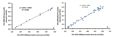 La Figura 2 muestra la relación entre la ETo para el período 1972-1990 en la Estación Experimental del IAgric en Alquizar y la del periodo 2008-2021 en la Estación meteorológica de Güira de Melena, tanto para los valores mensuales (figura 2a) como para los valores decenales (Figura 2b).