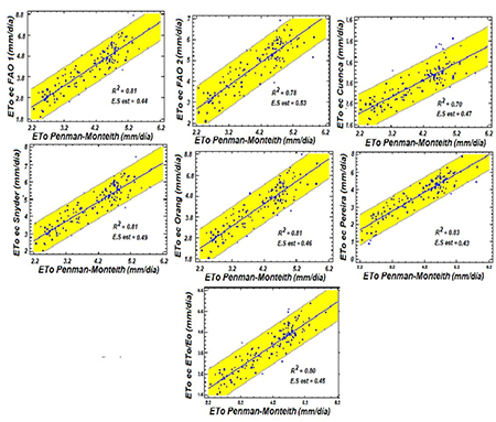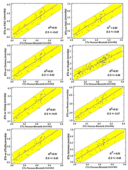 Como puede observarse en la Figura 3, todos los modelos, con excepción de FAO 2, y Cuenca muestran coeficientes de determinación (R2) iguales o superiores al 0,80, con el mayor valor correspondiente al modelo de Pereira (0,83).
