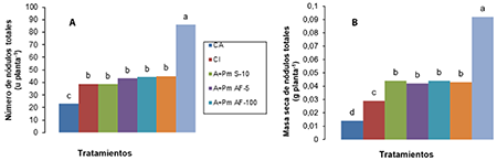 En el estudio se evidenció mayor efectividad de las bacterias en el inoculante Azofert®-F respecto a la de posibles rizobios residentes en el suelo que se empleó como sustrato para el crecimiento de las plantas. Tanto las plantas que solo se trataron con Azofert®-F (CI) como las que recibieron ambos bioestimulantes, mostraron incrementos en las variables de nodulación que se evaluaron con respecto al tratamiento control sin tratar (CA). En cuanto al efecto del bioestimulante Pectimorf®, se observó un mayor número de nódulos e incrementos en la masa seca de los nódulos cuando se combinó la aplicación a las semillas (10 mg L-1) con la aspersión foliar a la concentración de 100 mg L-1 (Figura 1). Es importante destacar, además, que la masa seca de los nódulos de las plantas que se trataron con Pectimorf® en sus dos formas de aplicación, así como su combinación, fue mayor que en el caso de las que solo se biofertilizaron con Azofert®-F (Figura 1B).