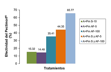 La combinación de la aplicación de Pectimorf® a las semillas y por aspersión foliar, en plantas biofertilizadas con Azofert®-F cultivadas en condiciones semicontroladas, mostró un efecto significativo en el proceso de nodulación y en el crecimiento de las plantas de frijol común, con incrementos por encima de un 40 % con respecto a las plantas que solo se biofertilizaron, destacándose la concentración de 100 mg L-1.