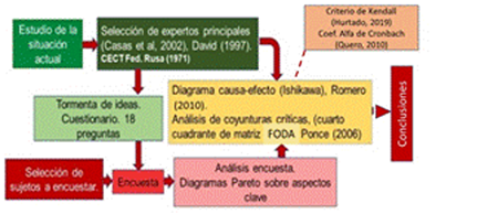 Con vistas a estudiar la visión del productor sobre la situación de la mecanización se realizó un estudio preliminar, donde se profundizó en los factores que la determinan, relacionados en la introducción a este trabajo, buscándose el consenso de especialistas de las bases productivas, mediante encuesta realizada en el año 2020 en 11 unidades seleccionadas en la provincia Cienfuegos. Su secuencia de organización fue: a) selección de personal para apoyar en la confección de la encuesta (grupo 1) y del personal a encuestar (grupo 2); b) confección de cuestionario estandarizado a partir del estudio previo y de una tormenta de ideas; c) ejecución de encuesta; d) procesamiento de la información, análisis de concordancia; y construcción de Diagramas Pareto (2019) sobre los aspectos clave; e) construcción de diagrama causa - efecto o de Ishikawa Romero & Díaz (2010), f) análisis de las coyunturas de mayor criticidad en el cuarto cuadrante de la matriz FODA (debilidades y amenazas) Ponce-Talancón (2006) y g) conclusiones.