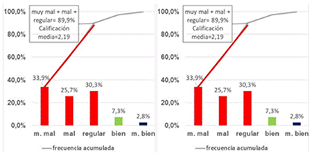 Las Figuras 3 - 11 muestran diagramas de Pareto respecto a los temas de la encuesta que tuvieron respuestas promedio “entre mal y regular”. En los nueve esquemas se sugiere además de presentar las frecuencias de evaluaciones mm., m., r., b., mb ya explicadas, la suma de las tres primeras como categoría que representa una opinión desfavorable del tema analizado. La frecuencia promedio de esa expresión de insatisfacción fue de 79,5%, similar al 80% que debe corresponder a la categoría principal en la curva integral de frecuencias de los diagramas de Pareto.