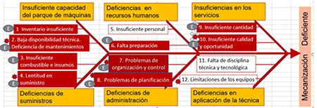 En el esquema se definen las seis espinas principales enunciadas en la introducción a este trabajo como causales de las deficiencias de la mecanización en la base productiva. A ellas tributa un conjunto de espinas secundarias definidas en los estudios. Las enunciadas en cuadros rojos marcados con una E constituyen aspectos estudiados en la encuesta, el resto se concibió a partir de la inspección realizada. Los cuadros marcados con una estrella representan aspectos negativos potenciados por la fragmentación actual del parque de maquinaria, que constituye una dificultad para realizar los mantenimientos por falta de las instalaciones necesarias en muchas de las bases productivas, contribuye a la lentitud de los abastecimientos y afecta la organización y control de la maquinaria, por la baja concentración de equipos en operaciones y la calidad y oportunidad de los servicios, dado a la falta de equipos y multiplicidad de destinos.