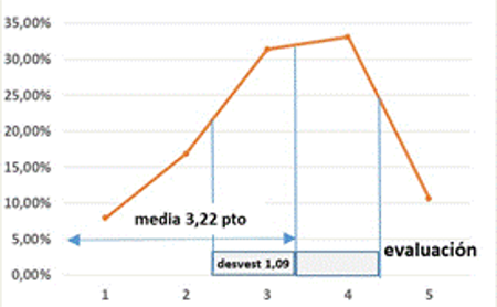 El gráfico de la figura 2 muestra la distribución de la totalidad de las evaluaciones realizadas donde el 64,5% de las mismas se encuentra en el rango entre tres y cuatro puntos en una distribución con asimetría izquierda, resultando una media de 3,22 puntos, que indica una situación de “regular hacia mal”, con un coeficiente de variación de 34%.