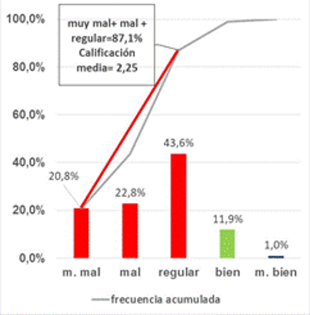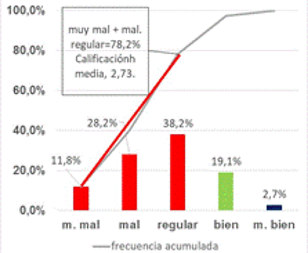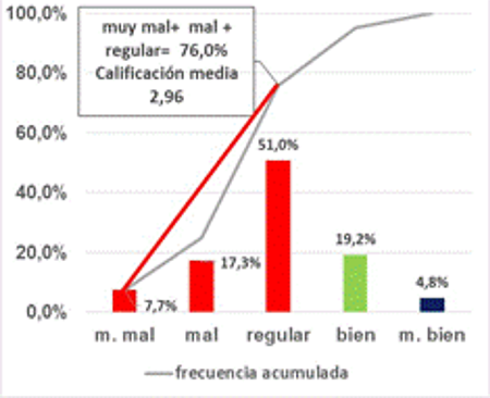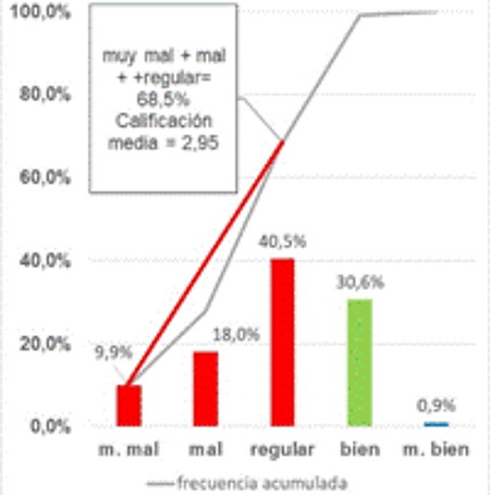Si se analizan las calificaciones por aspecto, se comprueba que solo tres fueron superiores a cuatro puntos, considerándose “ente bien y muy bien”, cuatro superiores a 3,5 puntos valorándose en el marco “entre regular y bien”, dos tuvieron calificaciones medias entre tres y 3,5 puntos, ubicándose en el tramo “regular hacia mal” y nueve inferiores a tres puntos y por tanto “malas y muy malas”.