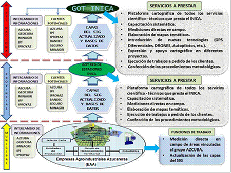 El servicio constituyó la expresión cartográfica de los servicios científico-técnicos que ofrece el INICA al productor cañero como se muestra en la figura 3. Se trabaja en la implementación de la base de datos única (BDU) que sirva de base para la acción y toma de todos los datos de los servicios científicos técnicos desarrollados por el INICA sobre la plataforma del OT.