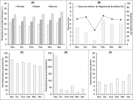 Para el estudio se realizó un análisis de algunas de las variables climáticas que pueden estar relacionada con el crecimiento y desarrollo del cultivo en la región: temperaturas promedio mensuales, precipitaciones acumuladas, incidencia de la neblina, humedad relativa y la velocidad de los vientos (Figura 2).
