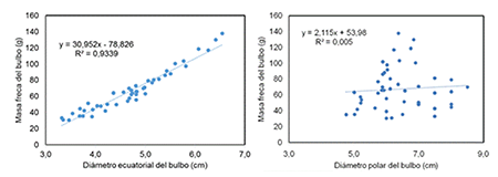 El coeficiente de determinación evidenció que el diámetro ecuatorial del bulbo determina en más de un 80% la masa fresca de este; mientras que, el diámetro polar no constituye una variable eficaz para la estimación de la biomasa (R2<0,01).