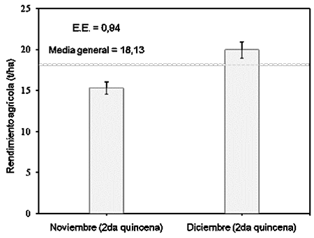 El rendimiento agrícola de los cultivares en las diferentes fechas de plantación superan el rendimiento medio del cultivo en el país (Figura 4). No obstante, se encontraron diferencias entre los valores obtenidos, los que excedieron las 20 t/ha cuando la plantación se realizó en la última quincena de diciembre. Este resultado puede estar determinado por el alargamiento de las horas luz y el aumento de las temperaturas a partir del mes de febrero, al respecto (López-Urquídez et al., 2017) manifiestan que la influencia del fotoperiodo es afectada por la calidad e intensidad de la luz, pues la luz infra roja y altas intensidades de luz favorecen el desarrollo del bulbo.