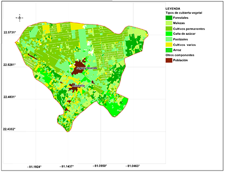 En la Figura 2 se muestra la distribución geoespacial de los principales tipos de cubierta vegetal que existen dentro de los límites del entorno. Sobresale la gran superficie ocupada por cultivos permanentes, en lo que inciden las extensas áreas de cítricos, estos cultivos son protectores de los suelos y otros componentes claves de los agroecosistemas, siempre que se manejen adecuadamente. Aunque en los últimos años los cítricos han sufrido un gran deterioro, el efecto que causaron sobre los suelos puede permanecer durante un largo período de tiempo, siempre que no haya cambios bruscos desfavorables en el uso y manejo. Lo contrario, sucede con los cultivos varios, en cuyas áreas los suelos, por lo general, permanecen desnudos durante una parte del ciclo anual, con lo que se exponen a la ocurrencia de procesos degradativos.