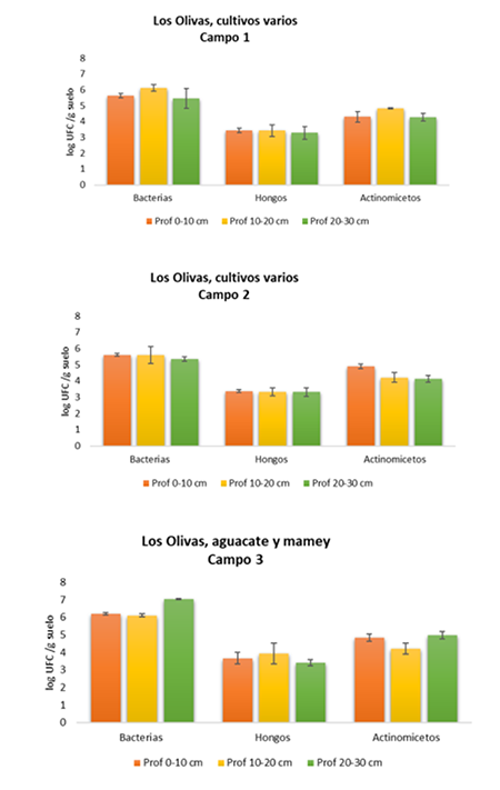 Los datos de conteos de cada grupo microbiano reportados en las tres profundidades del suelo 0-10, 10-20 y 20-30 cm muestran una tendencia más homogénea de los valores en las áreas de cultivos varios, dígase en el orden de 5, 3 y 4 (log UFC/g suelo) para bacterias, hongos y actinomicetos respectivamente; mientras que en la zona de cultivos de frutales los conteos de bacterias y actinomicetos abarcan el orden de 6-7 y 4-5 (log UFC/g suelo) respectivamente.